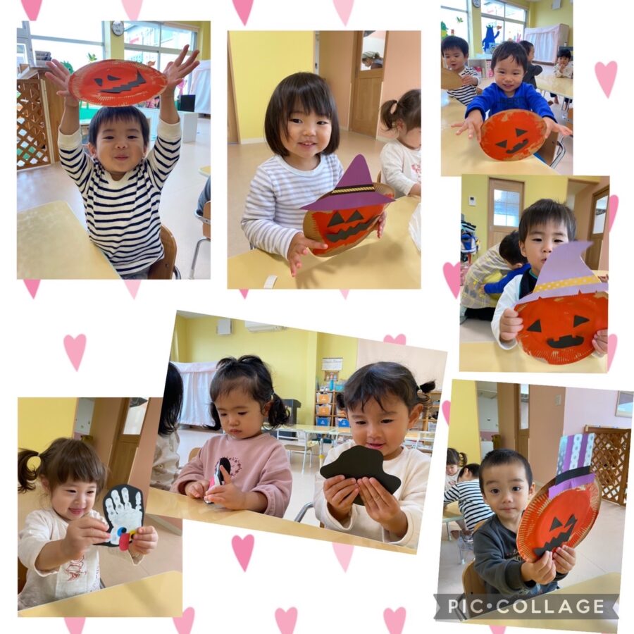 ミカン組さんは、ハロウィン製作の仕上げを行いました♪前にオレンジ色の絵の具で染めた紙皿に自分で選んだ顔のパーツを貼って完成させました😊