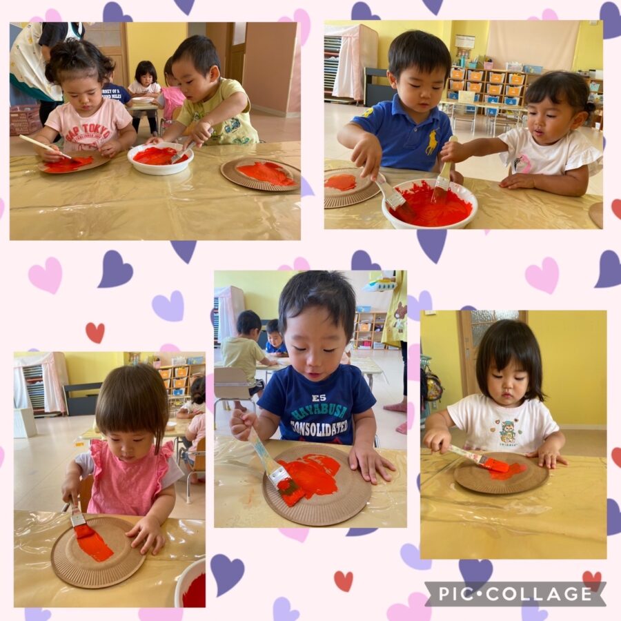 紙皿にオレンジ色の絵の具で色を染める作業に、子ども達は興味津々✨