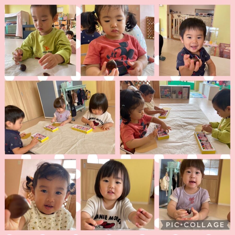 ミカン組さんは、前にお散歩で拾って来た栗🌰を触れたり、テーブルの上で転がしたり撫でたりしながら栗の観察を楽しみました😊