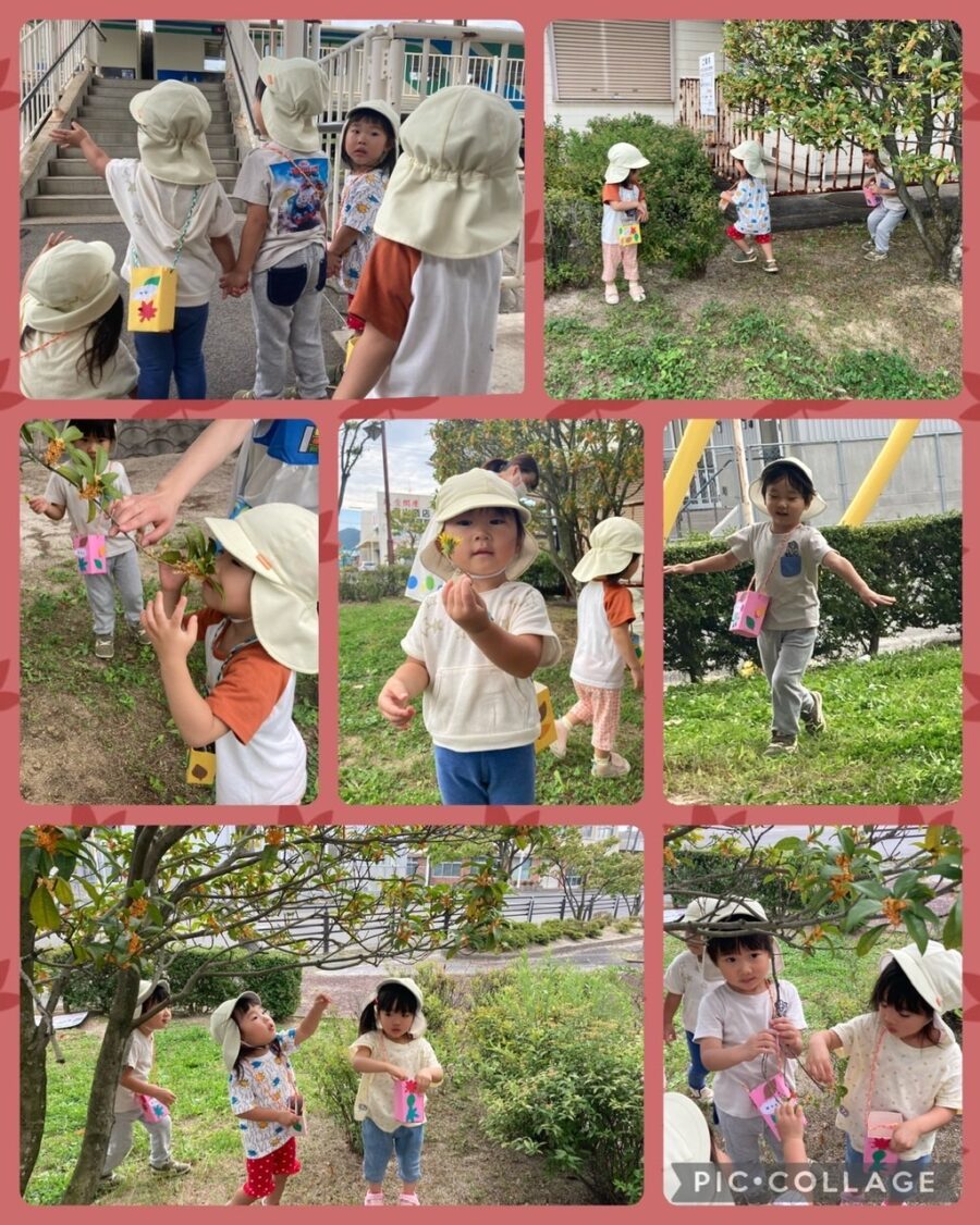 お散歩バックをもって卸町駅までお散歩に出かけたブルー組さん。秋の自然物を見つけては大切そうにバックにIN😊 金木犀の香り漂う中、元気いっぱい過ごしてきました♪
