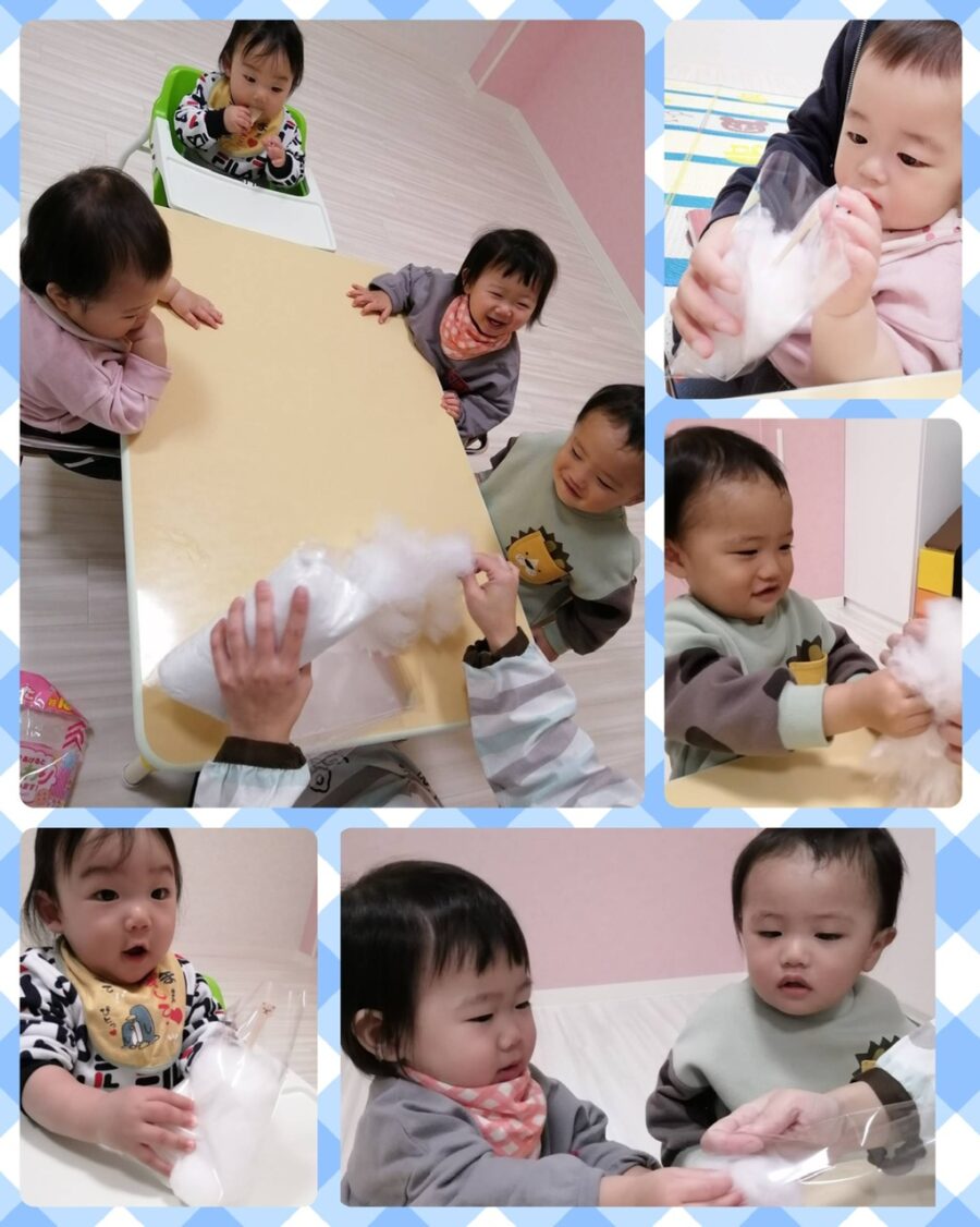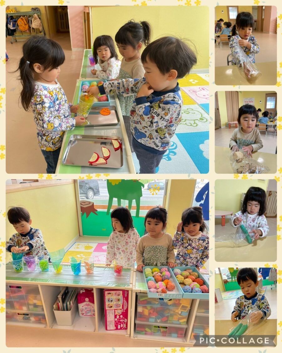 ポム組さんはお店屋さんごっこの製作をしました✨わたの感触を楽しみながら、一生懸命作ってくれました😄