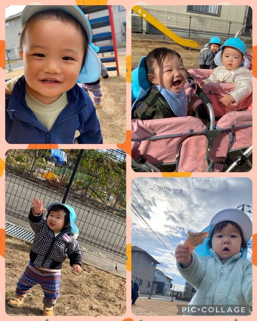 ポム組さんは、今日も天気が良かったのでお散歩へ♬公園では、シャボン玉に興味を示して手を伸ばしたり、落ち葉を拾い集めて上から降らせるどう大喜びのポム組さんでした😊