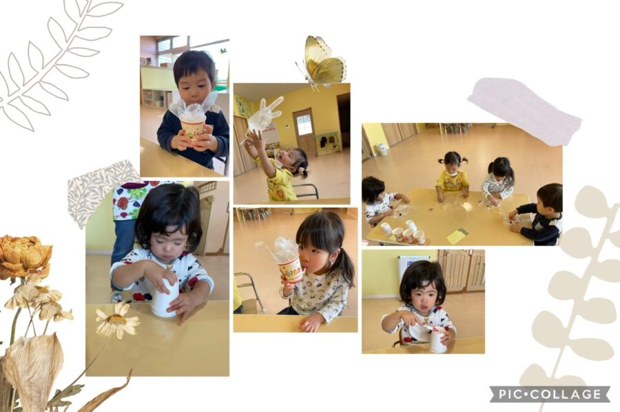 ミカン組とブルー組は一緒に運動場へ♫透明のカップにアイスクリームを作ったり、お皿にお料理をのせてお子様ランチを作ったお友達もいましたよ😊