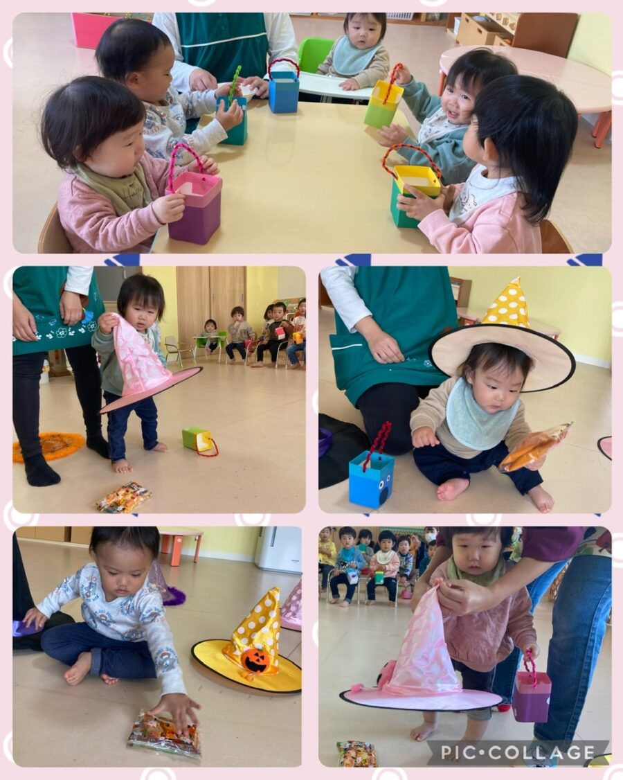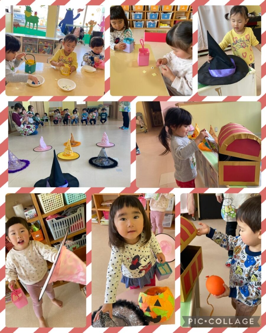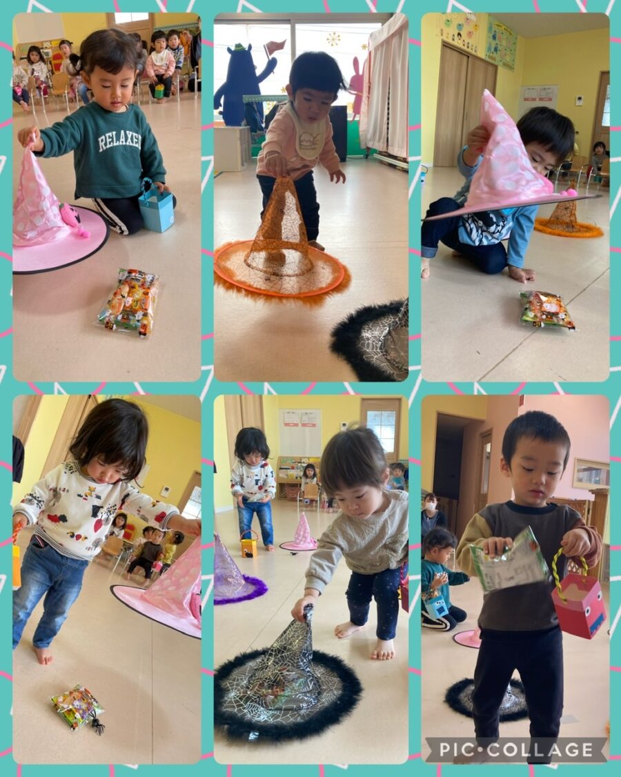 今日は全クラス合同で宝探しをしました。帽子の下や宝箱の中を探してお菓子をゲット♫自分達の作ったバックに入れて嬉しそうでした😊