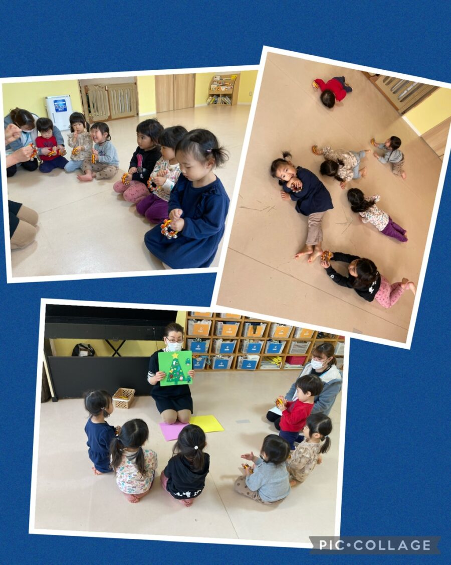 ブルー組さんもクリスマスの音楽に合わせてリズム遊びをしました。鈴の持ち方を教えてもらい、得意げに鳴らすブルー組のお友達♪とても上手でしたよ😊