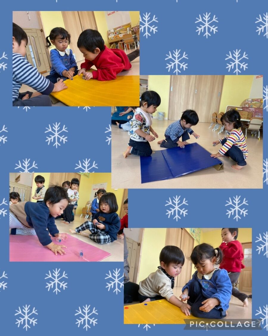 今日は、まゆ玉転がし遊びをしました♬初めての遊びに、子ども達も興味津々でした!1人一個ずつ手に持って、まゆ玉を転がしました😊いろんな方向や転げ方に子ども達は大喜びで夢中になって楽しんでました!