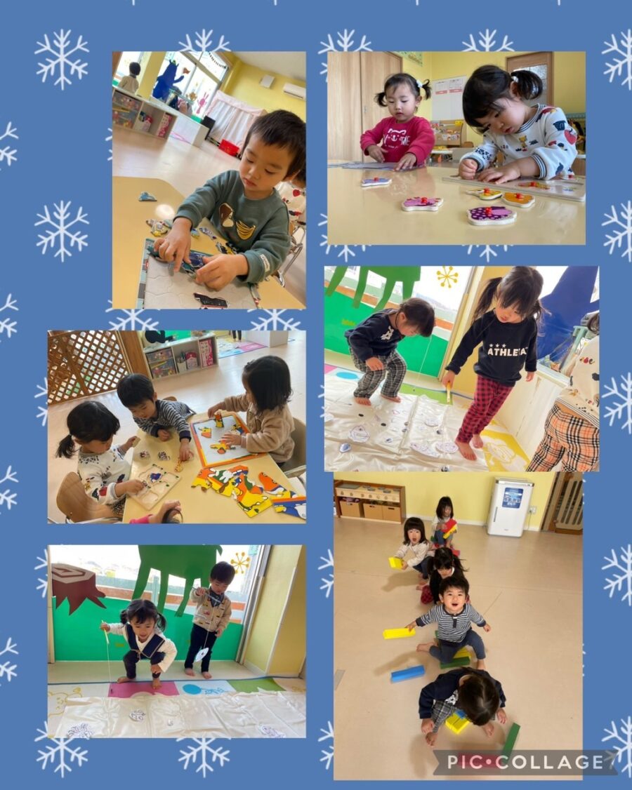 ブルー組さんとミカン組さんは、コーナー遊びをしました♪ソフト積み木、パズル、魚釣りと自分の好きな遊びを見つけて楽しみました😊