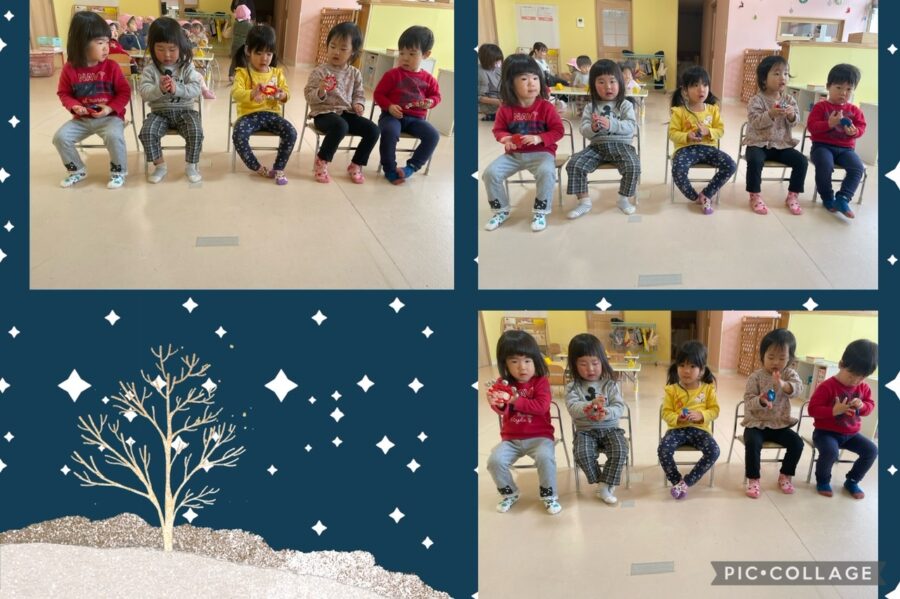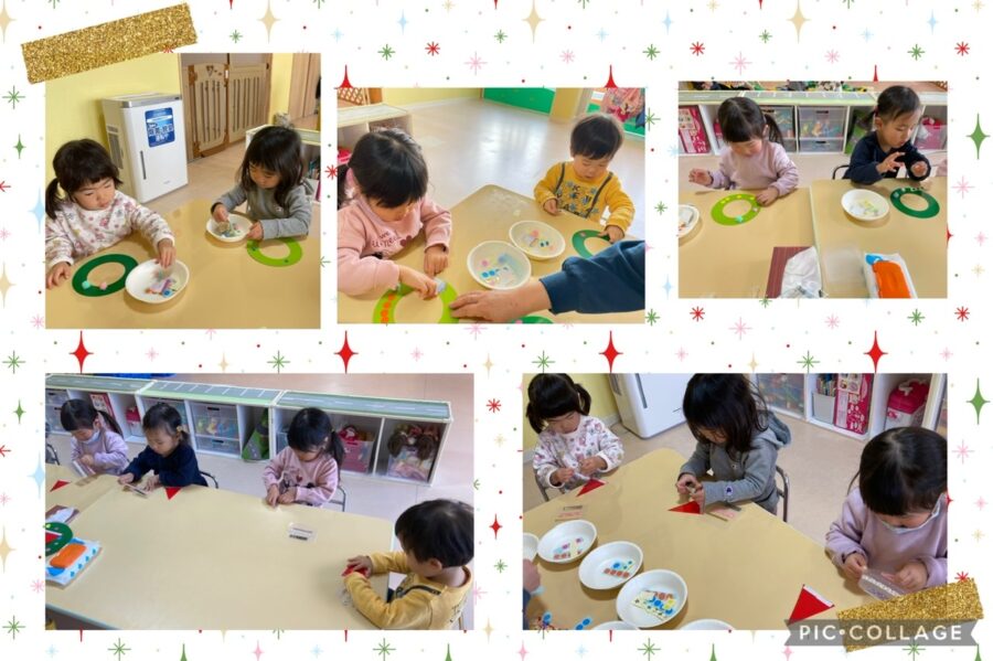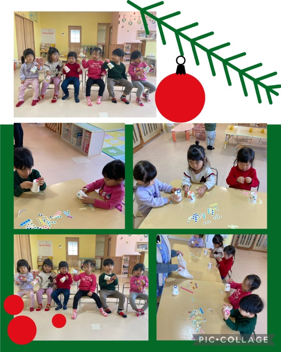ブルー組さんは製作で楽器作りをしました。思い思いにシールを貼って自分だけのベルを作りました。クリスマスの音楽に合わせて楽器を鳴らし満足そうなブルーさんでした♫