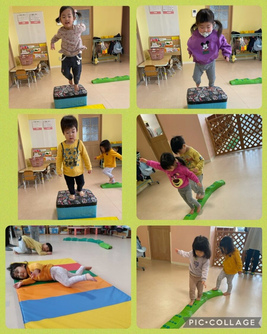 マットの上では、犬やカエルになりきったり、ゴロゴロで移動し、平均台を上手に渡っていました( *´꒳`* )