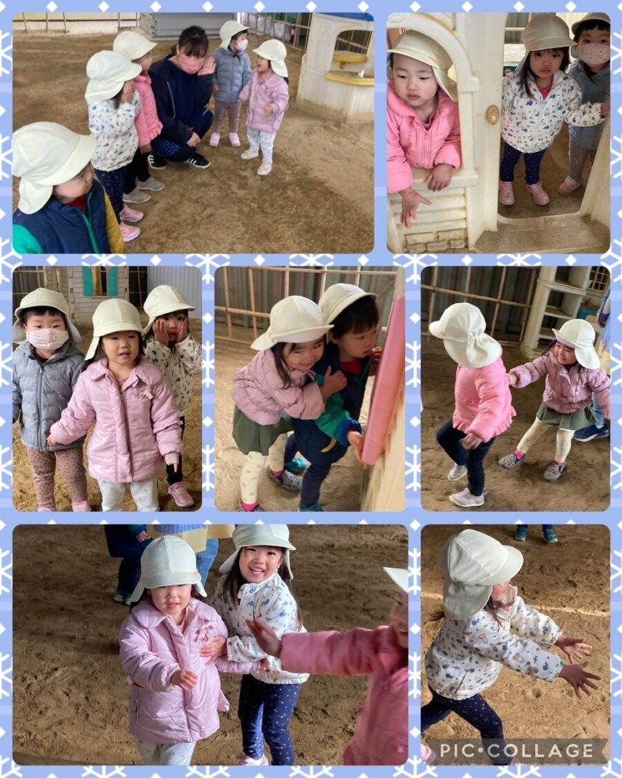 順番におおかみ役になって「おおかみさん」をみんなでしました✨おおかみに捕まらないように一生懸命逃げて楽しみました✨その後は、砂場でケーキやアイスなど作って楽しみました😊