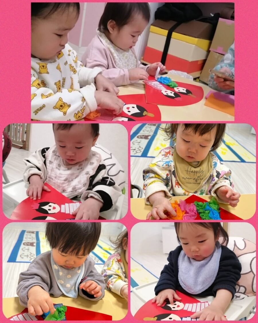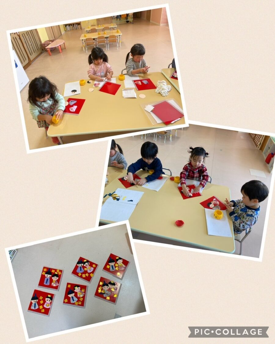 今日はひな祭りの製作をしました。のりを使って雛人形を貼ったりクレヨンでお顔を描いてそれぞれ可愛らしい作品ができました✨