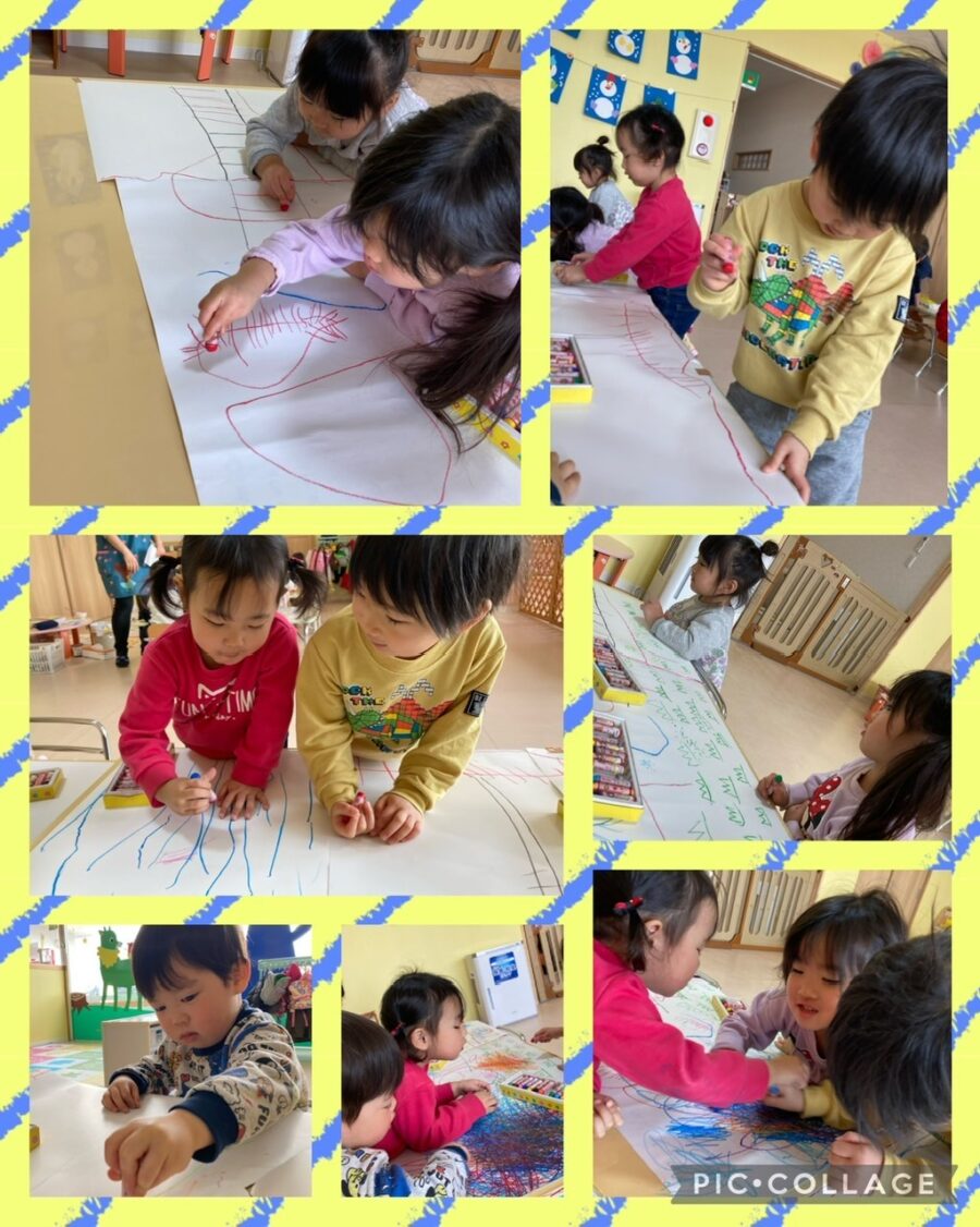 今日はクレヨンを使って大きい紙にお絵描きをしました。線路を描いたりお花を描くうちにお隣のお友達と繋げてみたり、一緒に色をぬったりと楽しそうなブルーさん😊紙いっぱいにダイナミックに描いていました♫