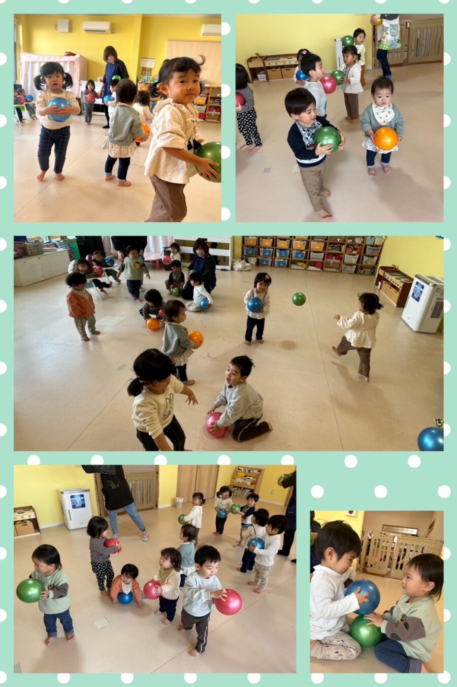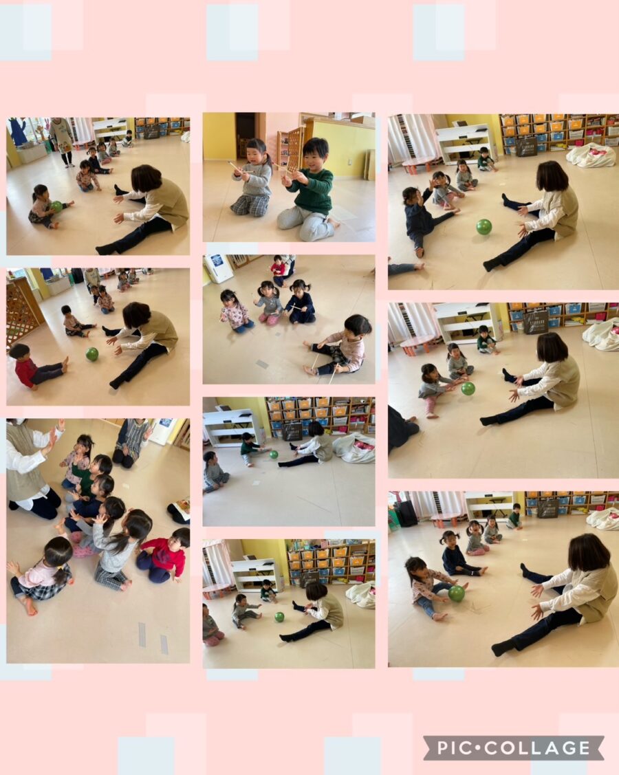 ミカン組さん、ポム組さんもリトミックに参加しました♬先生から、『ど〜っち⁇』の問いかけに自分達でいろいろな色の中から、ボールやタンバリンを選び、ピアノの音に合わせて鳴らしたりボールを椅子にしてバランスをとったりしながら楽しく参加しました😊