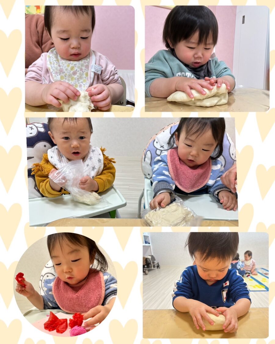 不思議な感触に始めは恐る恐るでしたが、握ったり、叩いたり、こねたり、ちぎったりと楽しんでくれました😄