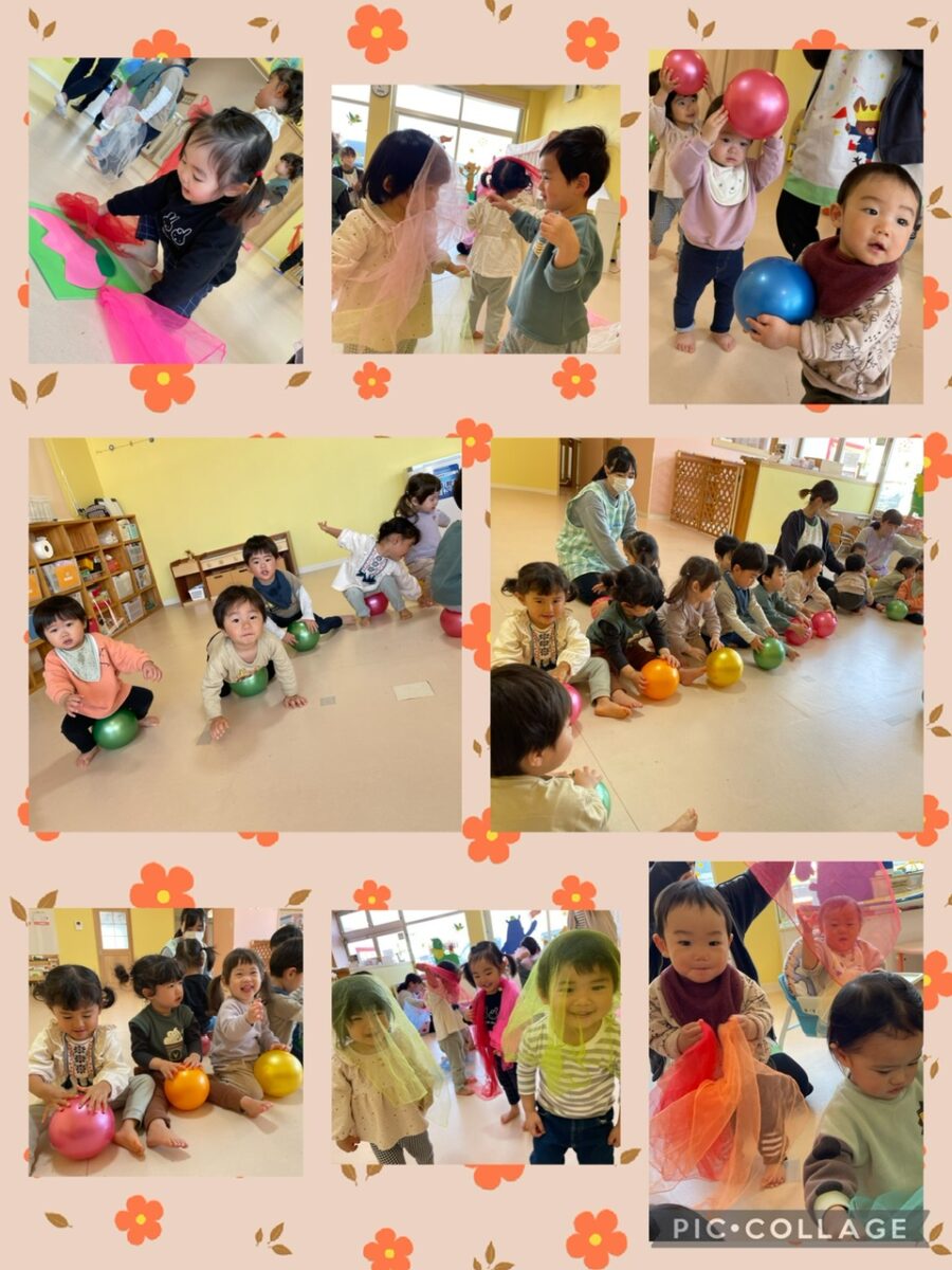 ポム組さんとミカン組さんは、ボールやカラフルな布を使ってリズム遊びを楽しみました♪