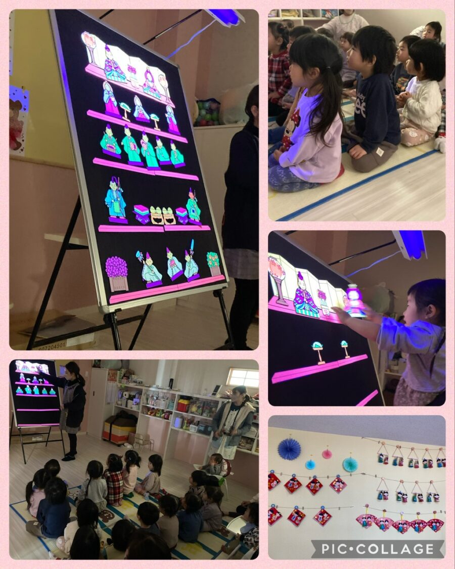 今日はひな祭り会でした。ブラックライトシアターでひな祭りの由来のお話を聞いた後、雛壇飾りゲームをしました。ブルー組さんはしっかりお話しを聞いていて上手にお雛様を並べてゲームを楽しんでいました😊