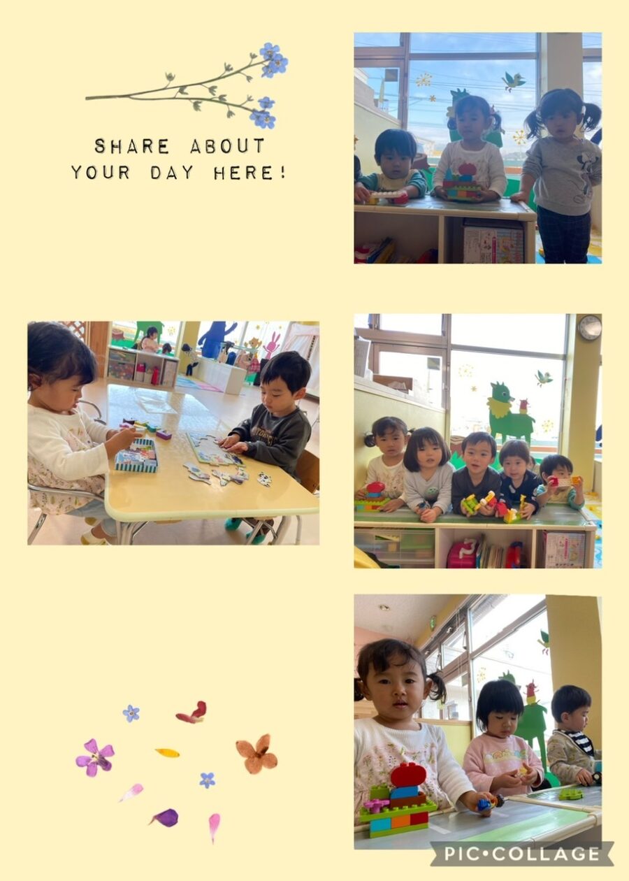 今日は、2歳児さんにプレゼントする写真フレーム作りをした後に、コーナー遊びをしました♬紐通しやパズルもコツを覚えて上達してます!!