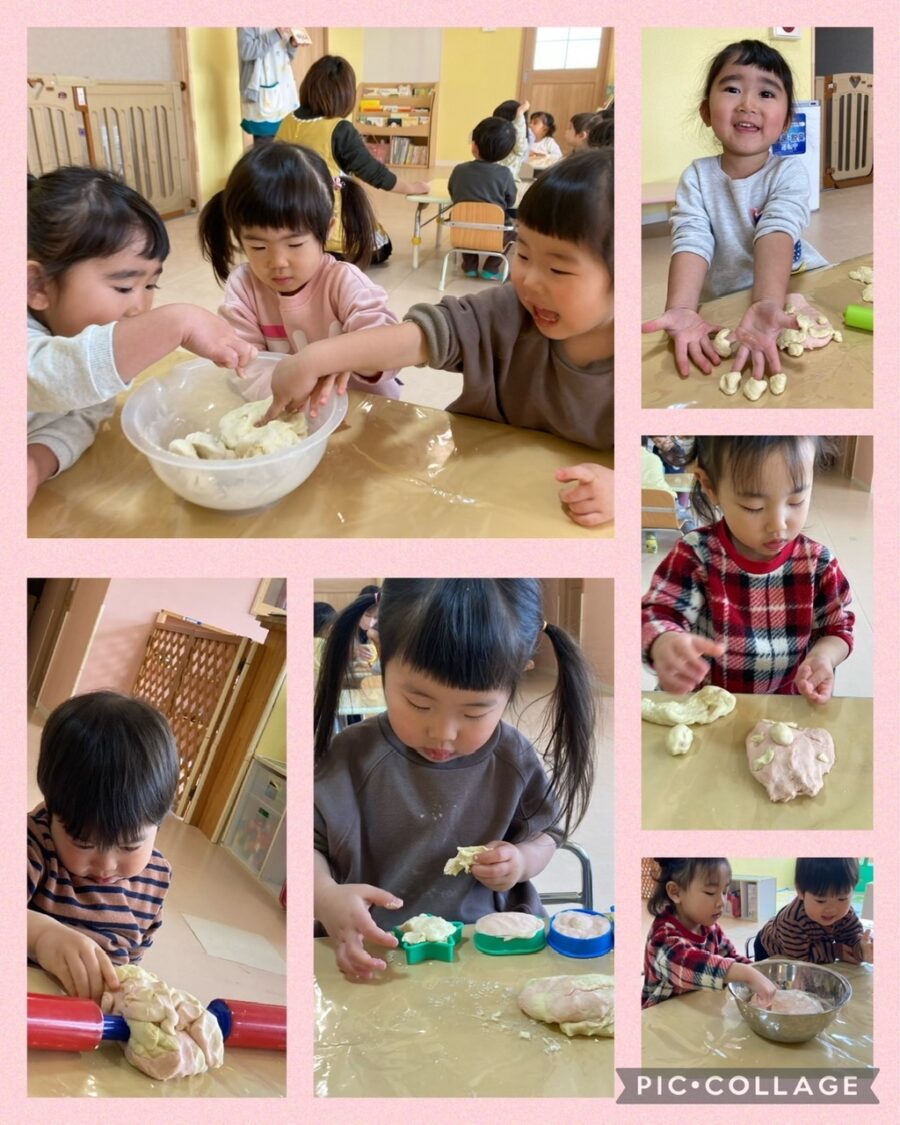 今日は小麦粉粘土をしました。ピンクと黄色の粘土を一人ひとり渡すと、色の混ざり具合を楽しむ子ども達♪