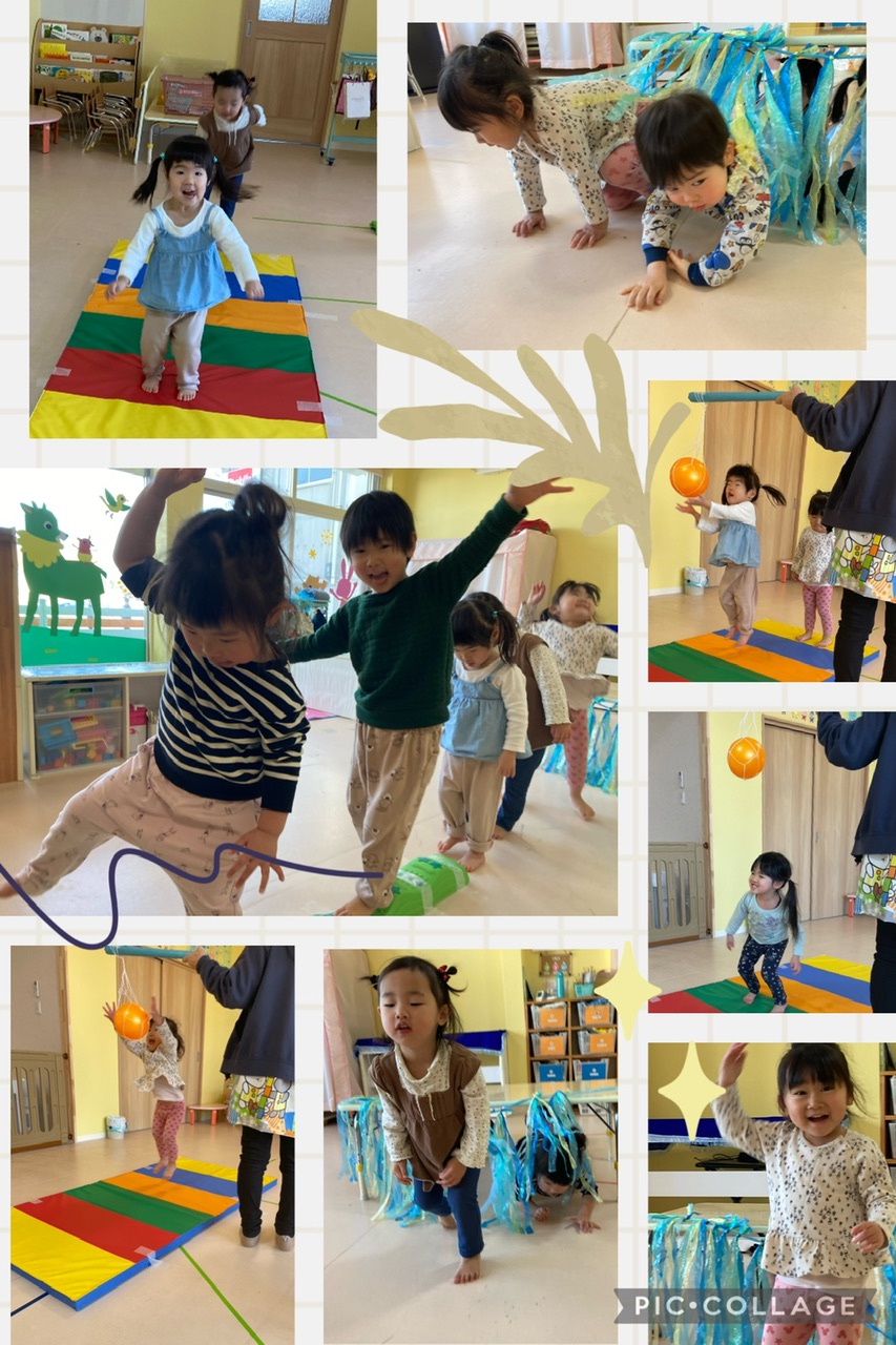 ブルー組さんはサーキット遊びをしました。トンネルをくぐったり、平均台を渡ったり、ジャンプしてボールにタッチしたりとたくさん体を動かしました♪