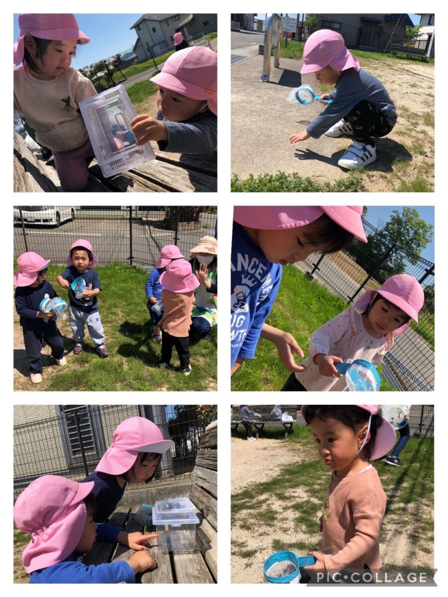 真剣な表情で虫を探し、保育者と一緒に網を使って捕まえると、「やったー‼︎」と大喜びのこども達😁