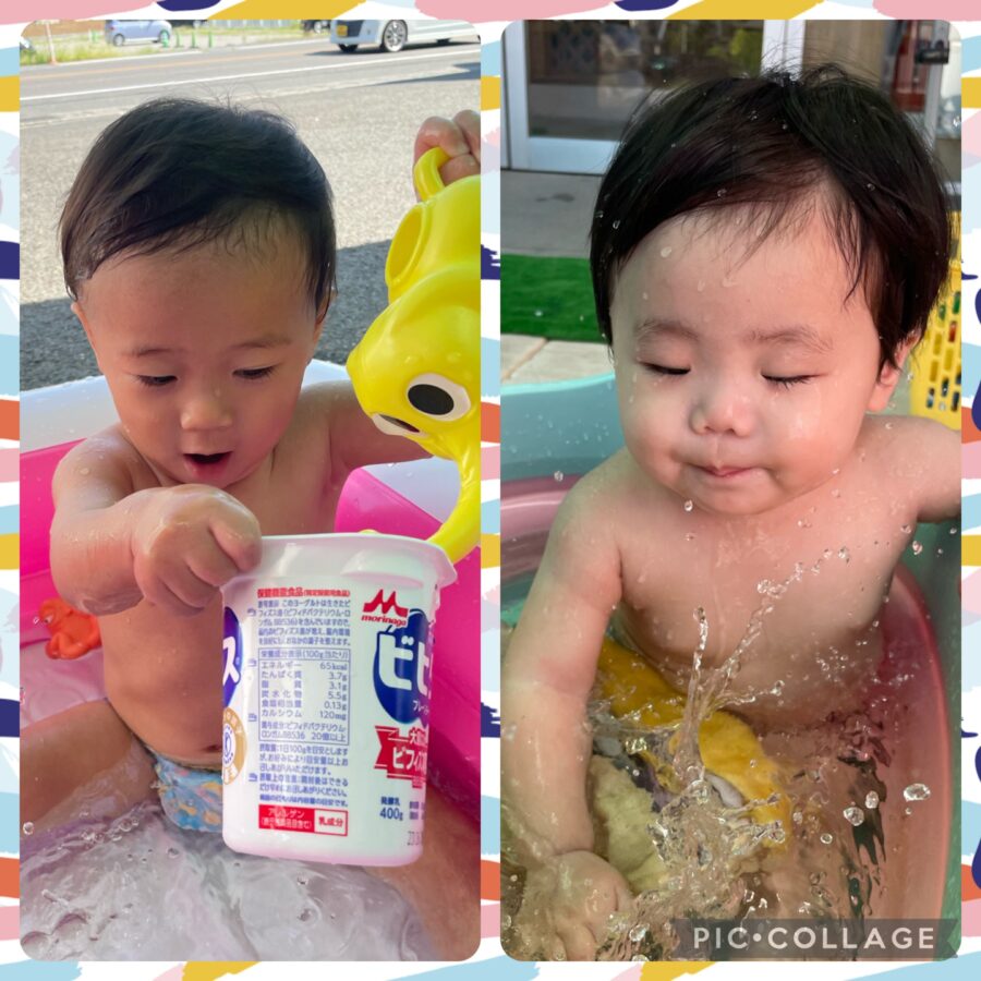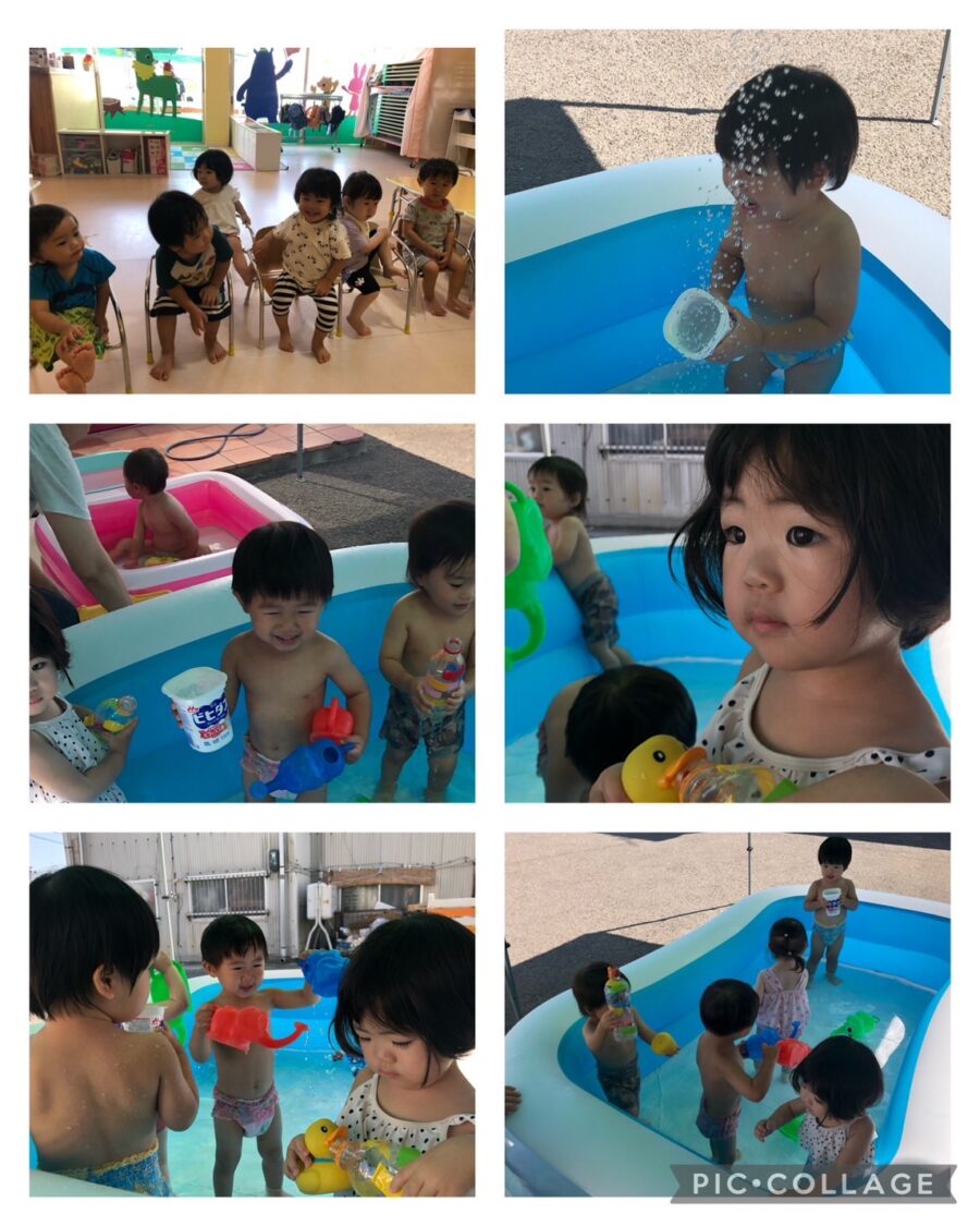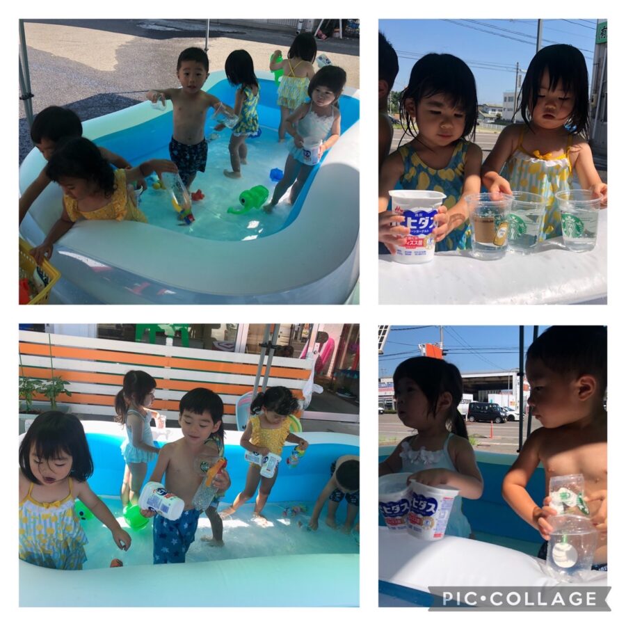 プールではカップに水を入れジュース屋さんごっこをしたり、ジョウロで身体に水をかけ気持ちよさそうにするこども達です😁