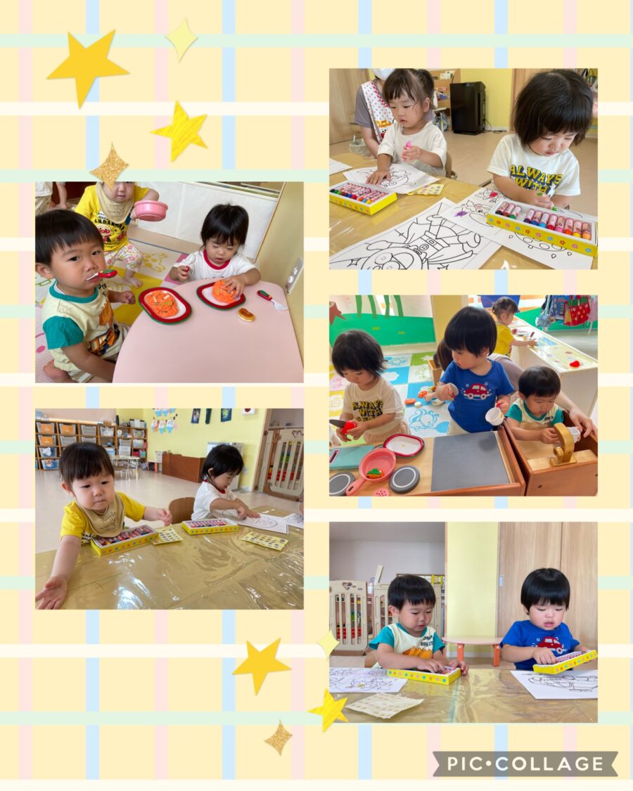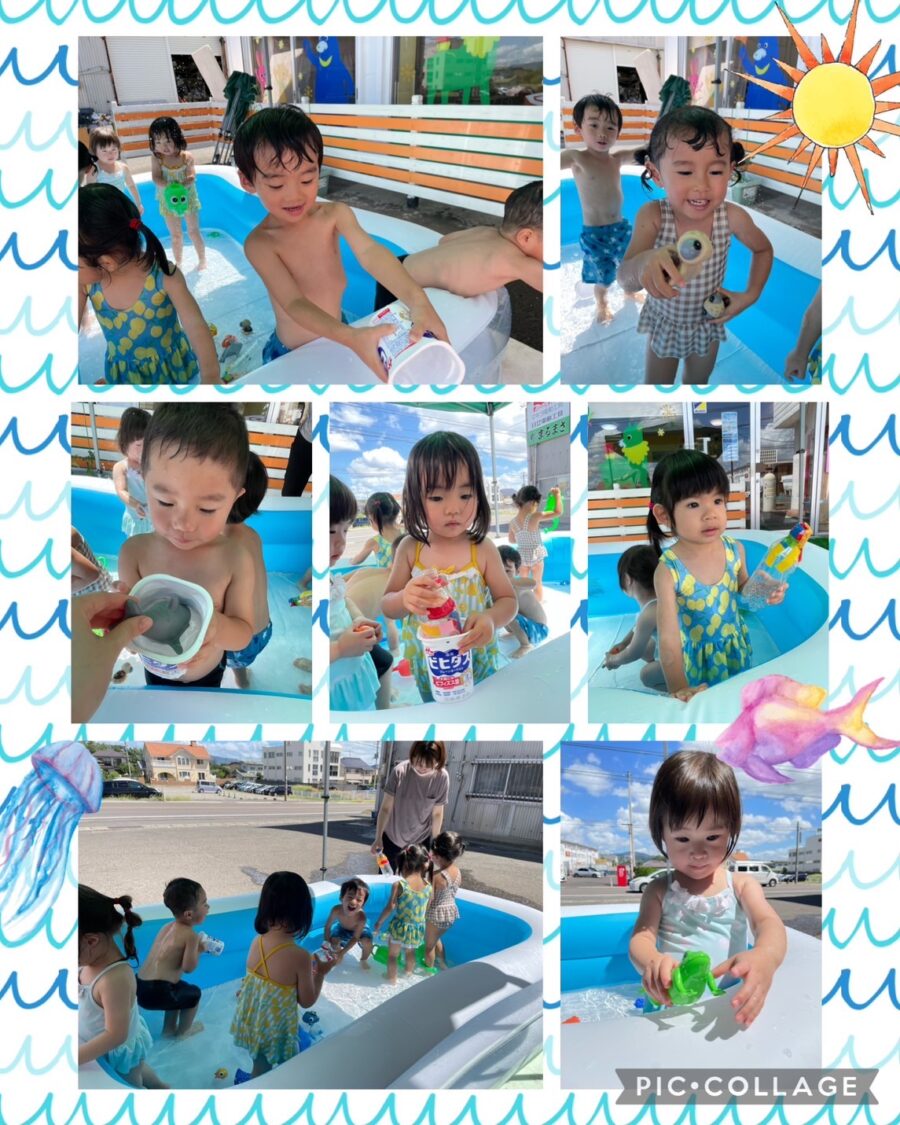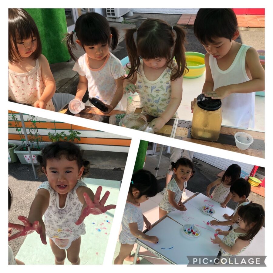 色氷でお絵描きをしたり、色水でジュース屋さんごっこをしたりと久しぶりの水遊びに大喜びのこども達でした😄