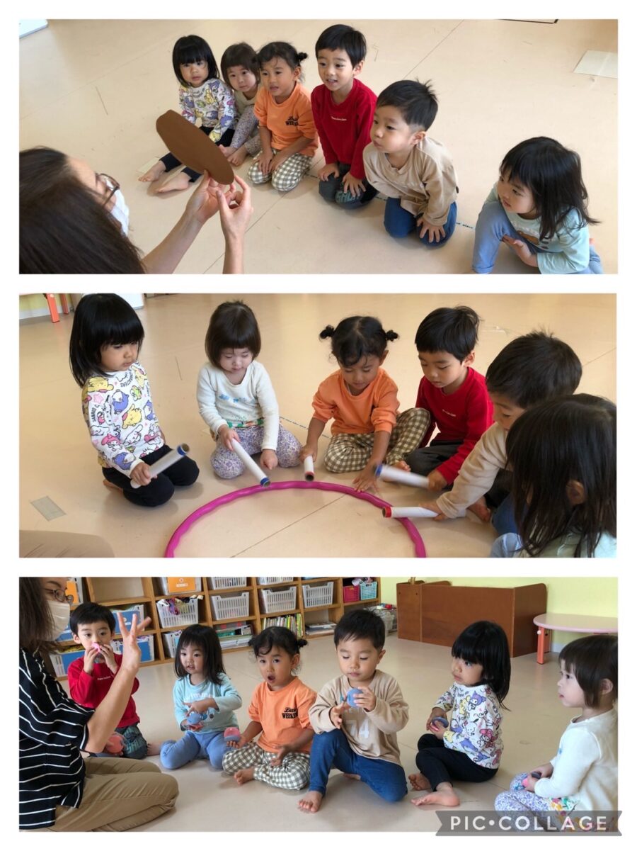 ブルー組さんはカスタネットを鳴らしたり🎶フラフープをお家(家)に見立て点検をしたり、ジャンプで飛び越えてみたりと仲良くリズム遊びを楽しみました😊