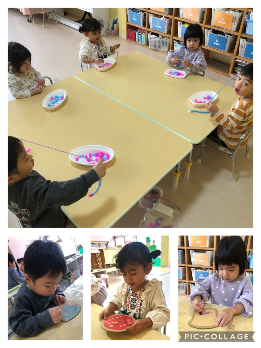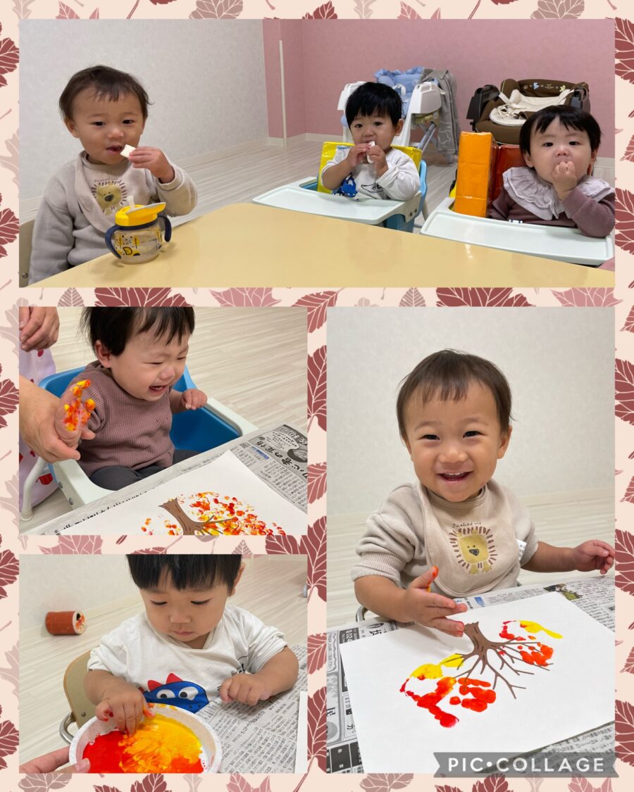 ポム組さんは、制作活動をしました☺️絵の具を手につけて、ペタペタ…綺麗な紅葉ができました✨おやつも、みんなで椅子に座ってお話しながら楽しく食べています🎵