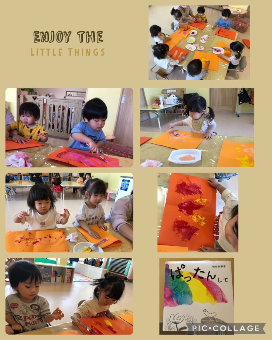 ミカン組さんはデカルコマニーの製作をしました!「ぱったんして」の絵本にちなんで、絵の具を塗ると自分で「ぱったん」と画用紙を折る姿がありました☺️ぱったんすると、蝶々の形になったり様々な模様ができました🌟