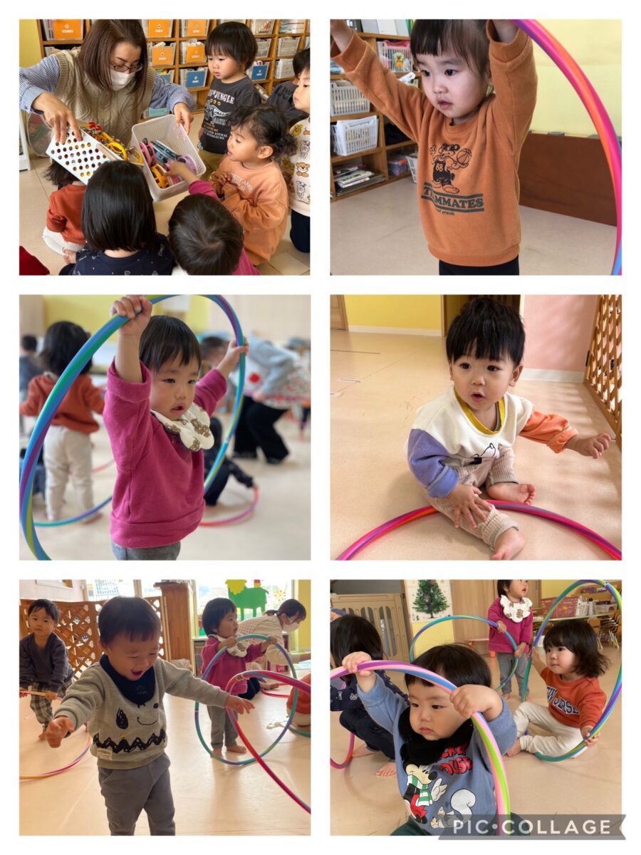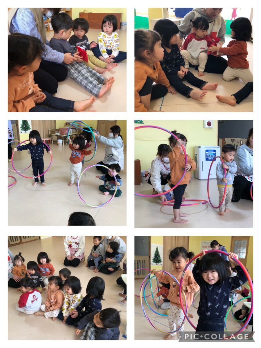 フラフープをソリに見立てたり、お友達に