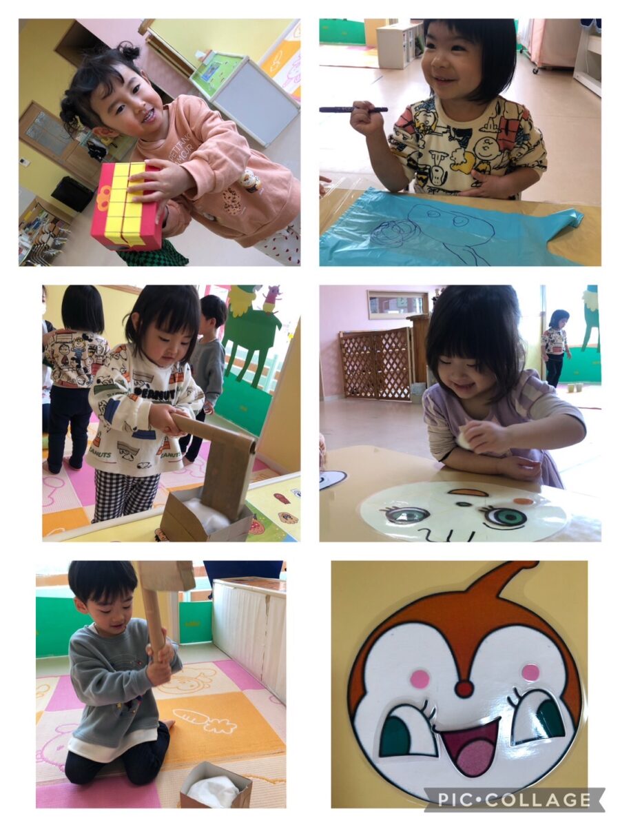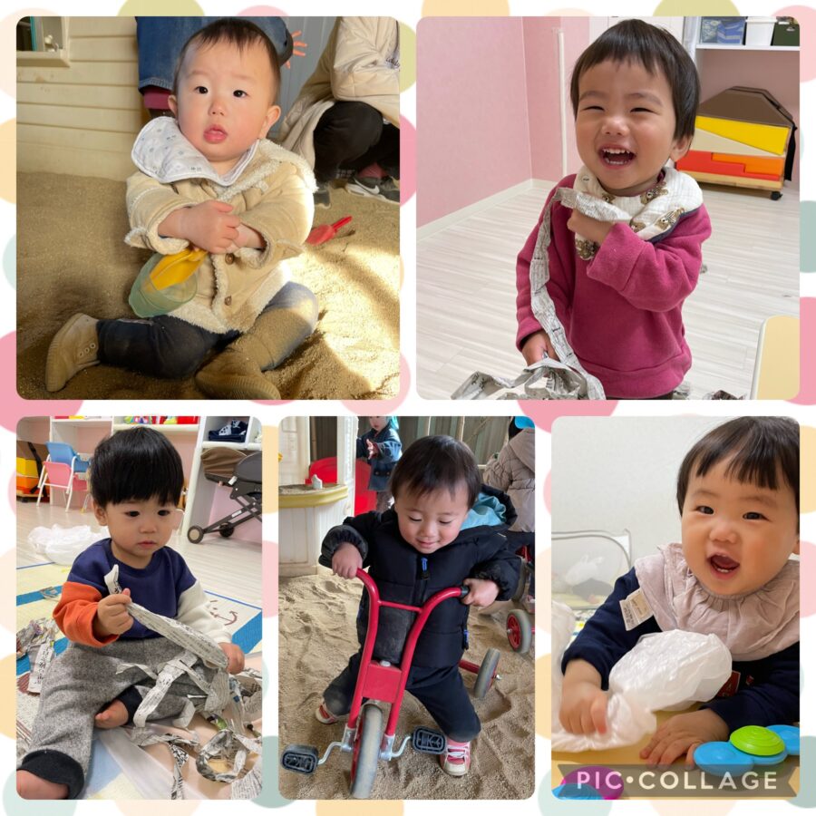 ポム組さんは、お部屋で新聞紙遊びをしたり、運動場に出て遊んだりしました☺️新聞紙を破いたり、ビニール袋でおばけになったりして、子どもたちも大喜びでした🎵運動場では、砂遊びや三輪車などがお気に入りです💕