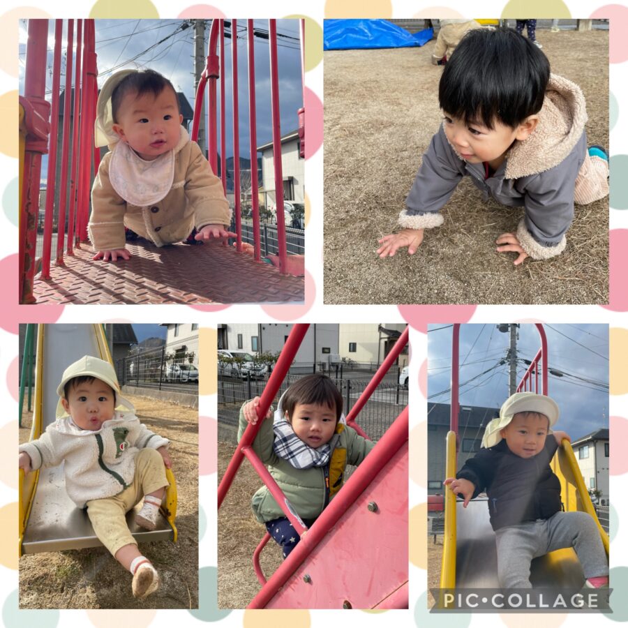 ポム組さんは、お散歩へ行ってきました♪はじめはシートに座っていた子どもたちも、動きが活発になり直接地面の上をハイハイしています☺️大きなすべり台に夢中です💕