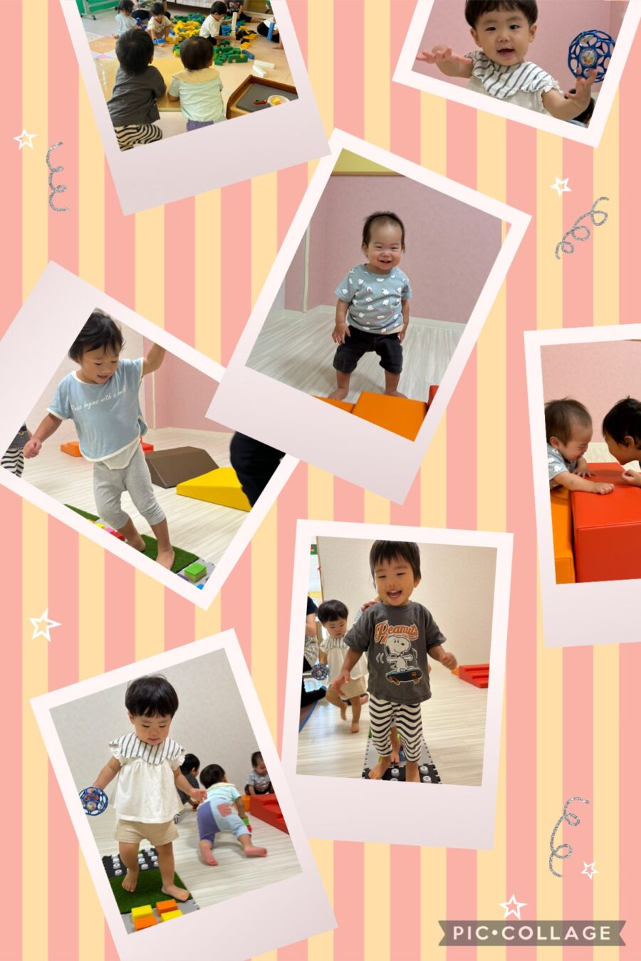 ポム組さんとミカン組さんは、一緒に活動しました💕足ツボマットの上を「痛いよー🤣」と言いながら何度も歩いていて、楽しそうでした✨その後は、ブルー組さんと一緒にブロック遊びもしました🍀