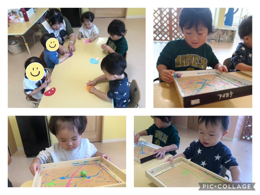 「どんぐりころころ」の曲に合わせて転がし絵を楽しむこども達でした😄