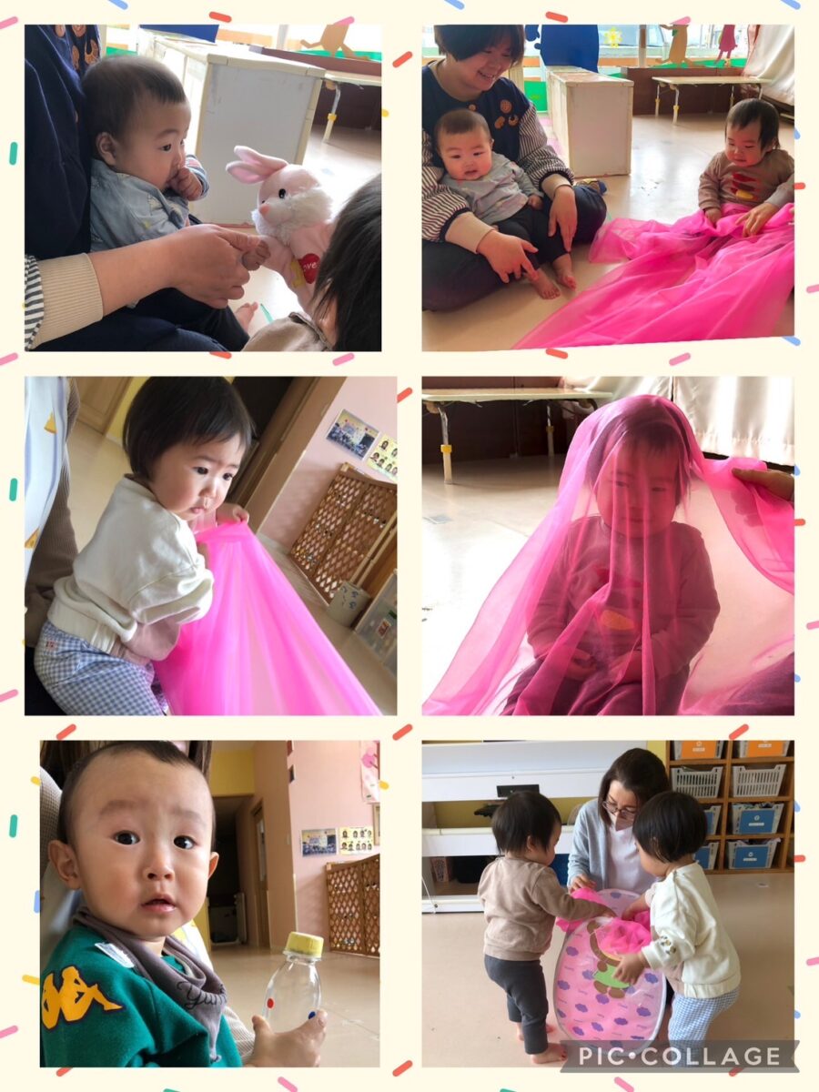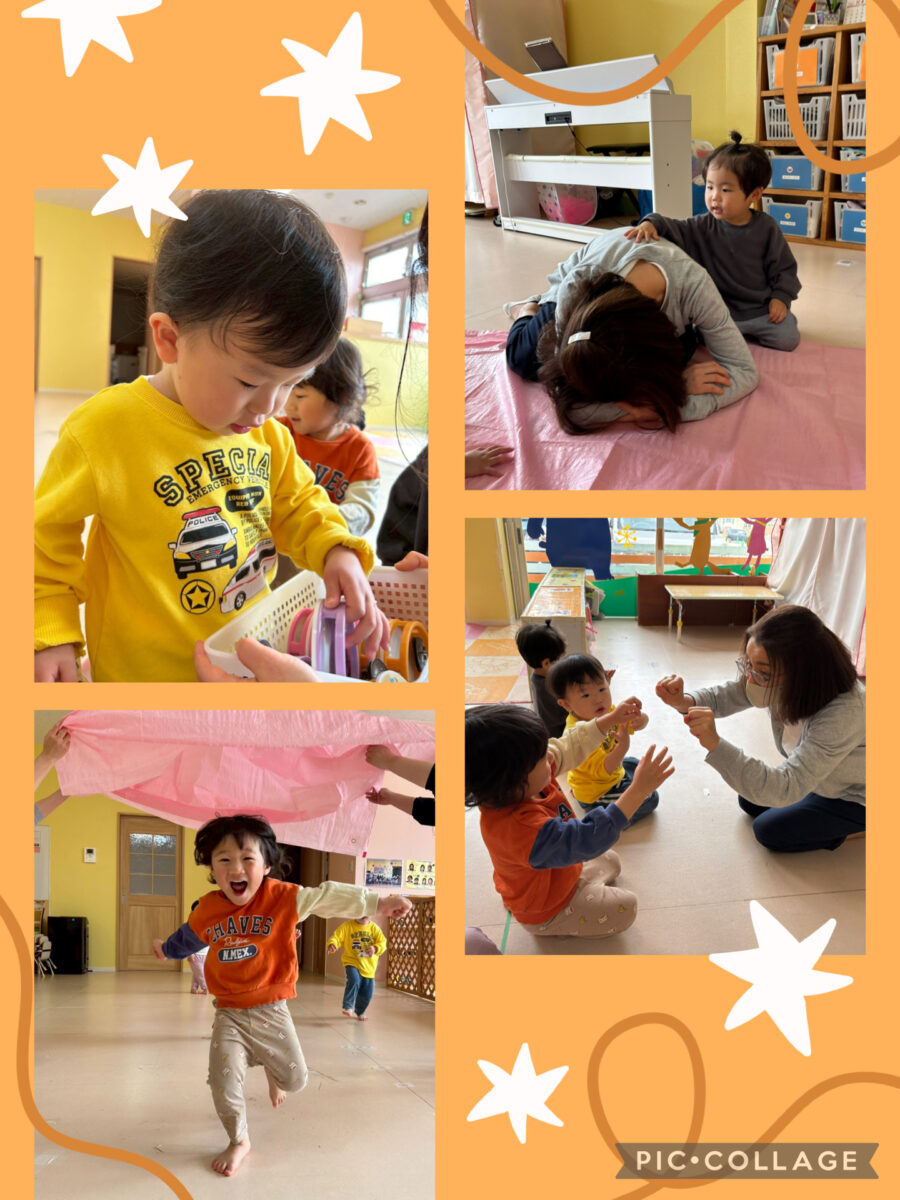中に隠れたり引っ張ってみたりとお友達や先生とのやりとりを楽しんでいました😊