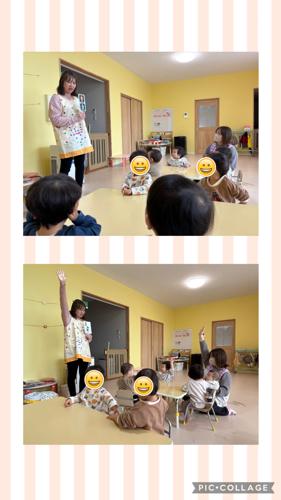 今日は、交通安全のお話をみんなで聞きました☺️「横断歩道を渡る時は信号機をよくみて、手をあげて渡ろうね」とイラストを使いながら説明すると、子どもたちもよくきいていました✨