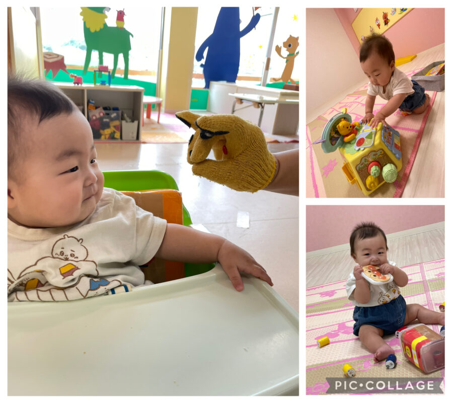 ボールを転がすとハイハイで追いかけたりアンパンマンのイラストを貼ると興味津々で近づいて手を伸ばしていました☺️