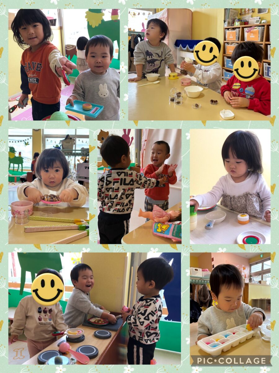 ポム組さんはお友達と手を繋いでお散歩ごっこしたり、好きな玩具で遊んだりして過ごしました!お名前を呼ぶと、お返事が上手で手をあげてくれます😊