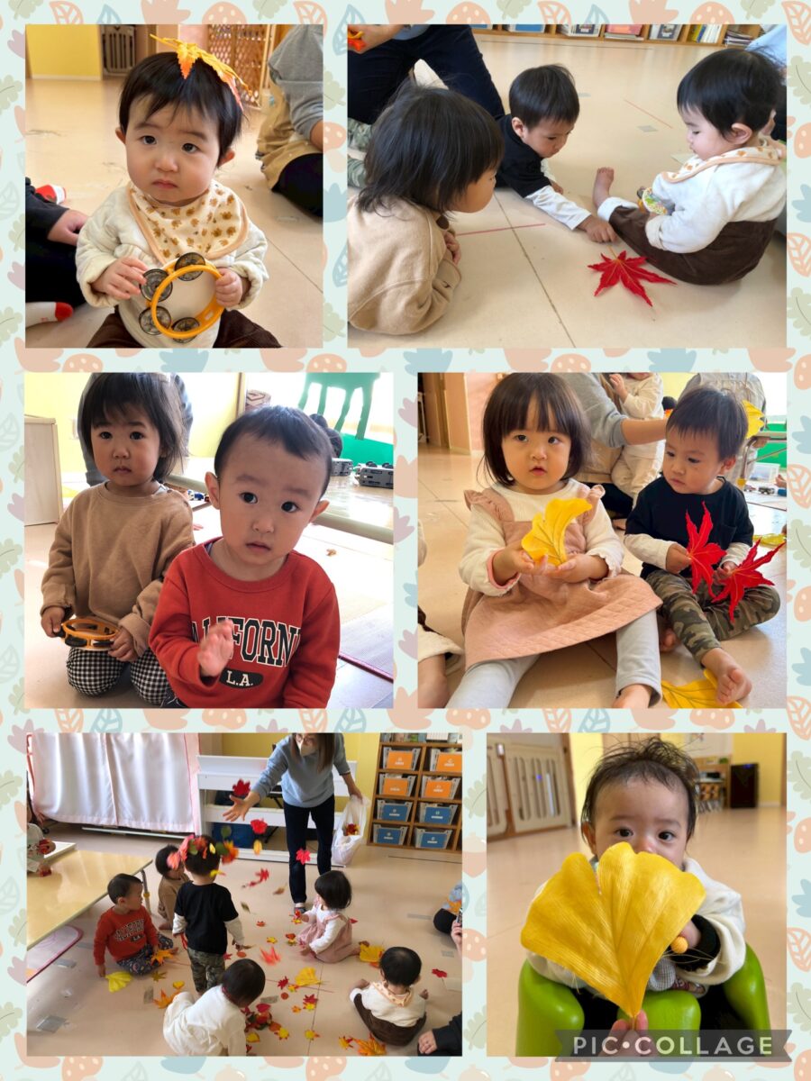 タンバリンを使ったり、落ち葉の玩具を使った