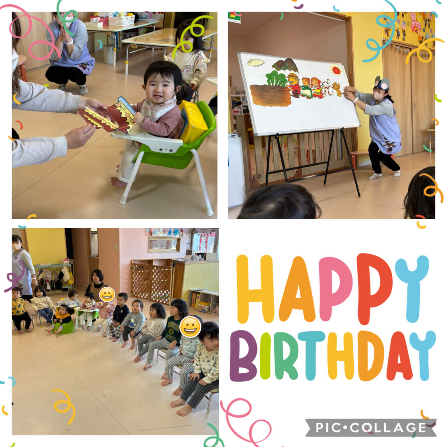 今日は、12月生まれのお友だちのお誕生会でした✨みんなで歌ったり、保育士による大きなかぶを見ながら楽しみました💓サプライズで登場したネズミさんに子どもたちも大喜びです🎵