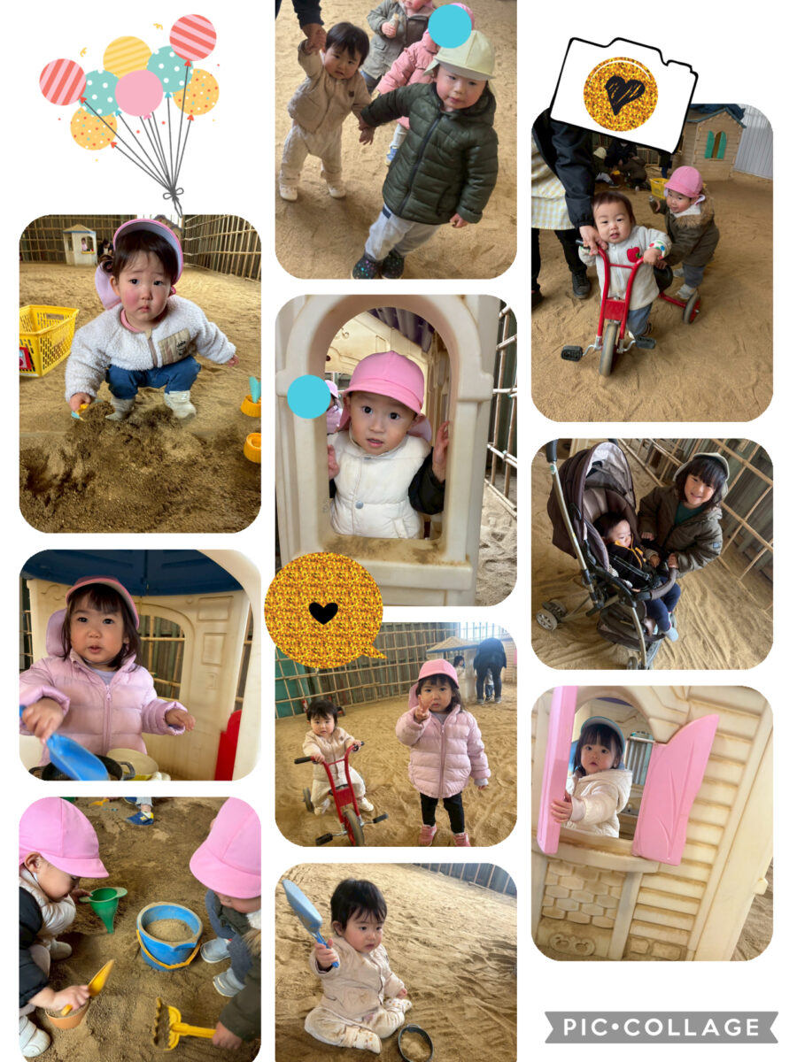 久しぶりの砂遊び。砂の感触を確かめたり、食べ物に見立てたりと楽しみました😊