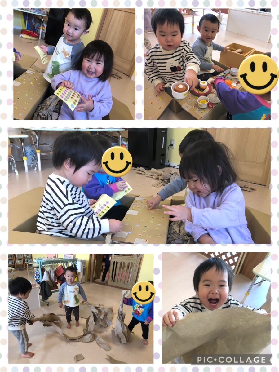 紙をビリビリ破いたり、ダンボールでお家を作ってままごとをしたりと、お友達とのやりとりを楽しみながらワイワイ遊びました!😄